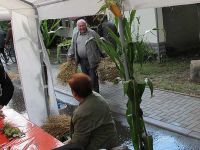 Überall waren, wie schon in den Vorjahren, kleine Buden aufgebaut, wo Handwerkszeug und aller möglicher Kram angeboten wurde. Auch die Leubinger waren wieder in Rohrborn. Heidi Schneider, vom dortigen Heimatverein ,saß am Spinnrad und ließ die Spule schnurren, während ihre Kolleginnen Butterbemmen schmierten, die mit Knoblauch noch einmal so gut schmeckten. Wir erwischten die Vereinsvorsitzende der Rohrborner Dorfgemeinschaft, Marina Jacob, um unser Mitbringsel zu übergeben - ein Sturmglas, wie es in unserer diesjährigen Sonderausstellung im Heimat und Waidmuseum von Hochstedt zu sehen war.