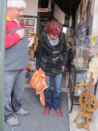 Das große Paket war schnell ausgepackt und das Exponat aufgestellt und mit Rohwolle dekoriert, wir hatten nämlich ein antikes Spinnrad erstanden. Damit es Frau Stange nach der Scheckübergabe enthüllen konnte hatten wir es nach dem Auspacken mit einem Tuch verhangen.