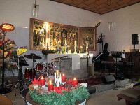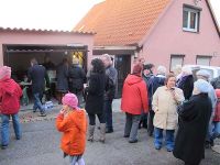 Die Organisation war aufgeteilt worden, so dass die Kirchengemeinde die Kirchendekoration übernommen, der Sportverein dafür gesorgt hatte, dass Stühle vom Bürgerhaus in die Kirche geschafft wurden und wir, vom Heimatverein, für das leibliche Wohl vor und nach dem Konzert zuständig waren. Dabei waren wir dankbar, dass wir eine unterhalb der Kirche stehende Garage als Glühweinstand nutzen durften. Dieser Versorgungspunkt musste zunächst erst einmal eingeräumt werden, was am Vormittag geschah. Mit Schaudern erinnerten wir uns daran, dass wir im letzten Jahr erhebliche Mehrarbeit durch den hoch auf der Straße liegenden Schnee hatten. Davon war aber an diesem 4. Advent 2011 nichts zu sehen, denn um die Kirche herum wuchs grünes Gras und standen schneelose Tannen.