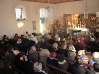 Nur wenig später trafen die ersten Konzertbesucher ein. Da der Eintritt frei war, rechneten wir mit einer vollen Kirche, was auch eintreffen sollte. Zuerst ging es aber darum, sich aufzuwärmen oder warmzuhalten. Ob nun mit Kinderpunsch, Tee, Glühwein, Grog oder Kaffee war ganz egal, Hauptsache die Flüssigkeit war heiß. Zum Glück spielte das Wetter mit, denn am Vormittag waren doch einige Tropfen vom Himmel gefallen. Jetzt, unmittelbar vor Konzertbeginn, war es zwar recht kühl aber wenigstens trocken. Die Uhr zeigte auf 14.30 Uhr, und nach und nach begaben sich die Besucher zur Kirche hinauf und suchten sich einen Platz.