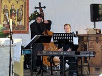 Das Konzert begann pünktlich um 15.00 Uhr, während durch die Südfenster der Kirche das Licht der tief stehenden Nachmittagssonne flutete. Schon nach den ersten Takten wurde mit den Fingern geschnippst, mit den Füßen gewippt und auch in die Hände geklatscht. Die geringste der Bewegungen zur von Steffen Heinze neu arrangierten Musik, bestand aus synchronem Kopfnicken, zu den Klängen, die der Schlagzeuger Wieland Götze im Zusammenspiel mit dem am Kontrabass zupfenden Uwe Rapp erzeugte.