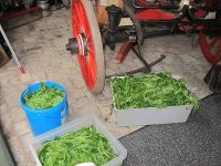 Da wir das Färberzelt am Museum aufstellen und mit frischem Waid färben wollten, musste der Waid noch gewaschen und zum Teil eingeweicht werden. Die Blätter wurden über Nacht im Museum gelagert. Der Waid war in Udestedt privat angebaut worden, damit wir unser Waidbeet, dass in diesem Jahr ohnehin kaum Ertrag bringen würde, nicht abernten mussten und es für die Besucher noch etwas zu sehen gab.