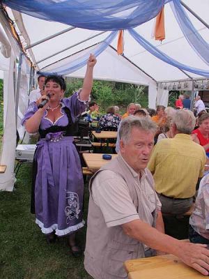 Im Hof herrschte indessen gute Stimmung unter den Gästen. Bei Kaffee und Kuchen wurde immer noch begeistert geschunkelt. Regina Ross wusste ihre Zuhörer zu begeistern und zog singend durch die Reihen, während sie ihre musikalische Reise durch Europa zum Besten gab.