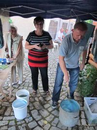Im Färberzelt wurde nicht nur gefärbt, sondern auch mit den am Vortag eingeweichten Waidblättern blauer Farbstoiff gewonnen. Dazu musste das so erzeugte Waidwasser so lange kräftig gerührt werden, bis sich blauer Schaum zeigte.