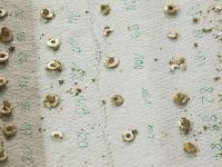 Neben den Knochen der Frau waren einige Hundezähne zu erkennen, die wohl einst als reicher Schmuck galten und entweder Bestandteil einer Kette oder auf die Kleidung aufgenäht worden waren. Die Zähne und Muschelscheiben zeugten von der herausragenden Stellung, die die Frau wohl innegehabt hatte. Noch eines wurde anhand der Knochen deutlich: Es handelte sich um eine jüngere Frau, denn ihr Gebiss war augenscheinlich vollständig erhalten und die Zähne in gutem Zustand. Weitere Erkenntnisse würden jedoch spätere Untersuchungen bringen. Nachdem wir einige Fotos gemacht und uns alles angesehen hatten, folgten wir Herrn Eichelmann und Herrn Paust in die Räume der Restaurierung, wo wir einzelne Funde aus dem Grab näher ansehen konnten. Einzeln nummeriert lagen so, fein säuberlich sortiert, die gefundenen Muschelplättchen - und seien sie auch in einzelne Stücke zerfallen - sowie die Hundezähne in Reihen in flachen Pappschachteln. Interessent war auch der Fund des Bruchstücks einer Steinklinge. In anderen Kartons lagen Quarze, die man im Grab gefunden hatte, zu denen Herr Paust später meinte, dass man sie lieber erst mal aufgehoben hatte, weil man nicht wissen konnte, ob sie Beigaben waren. Er sagte dann aber, dass man im umgebenden Erdreich ähnliche Quarzsteine gefunden hatte, was vermuten lässt, dass es sich also um normales "Zubehör" in der Erde handelte.