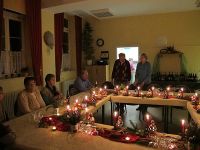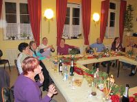 Die Weihnachtsfeier vom Heimatverein fand am 14. Dezember 2012 im Hochstedter Bürgerhaus statt. Wie immer hatten wir vorher für gemütliche Stimmung mit weihnachtlicher Dekoration gesorgt. Dazu gehörten Samttücher in rot und gold auf den Tischen, wie auch kleine Keramikfiguren, die jeweils mit einer Kerze und einem Teelicht für die richtige Beleuchtung sorgten. Auch Tannenzweige und Nüsse gab es auf den Tischen zu finden. Wir hatten uns einen wahren Festschmaus bestellt, der aus Entenbrust, Rinderbraten und Schweinegeschnetzeltem bestand. Überpünktlich wurde das Essen gebracht, so dass kurz nach dem Beginn der Weihnachtsfeier zum Sturm auf das Buffet geblasen werden konnte.
