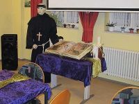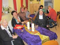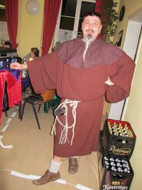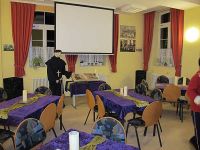 Ein weiterer Themenabend war für den 2. März 2013 geplant. Passend zu unserer Sonderausstellung im Museum, bei der es um die Benediktiner und ihre Beziehungen zu Hochstedt ging, war dieser Abend nicht ganz ernsthaft kirchlichen Themen gewidmet. Am Vortag begannen wir wieder mit der Ausgestaltung des Raumes im Bürgerhaus und stellten Tische auf, die mit violettem und goldenem Samt bedeckt wurden. Zur Unterstützung und als Dekoration holten wir unseren Benediktiner aus dem Museum und den Weinstock gleich mit dazu. Auch das aufgeschlagene Buch, welches die mit goldenen Details verzierte Biblia Pauperum darstellte, "wanderte" aus der Ausstellung für einen Abend in das Bürgerhaus. Wir wollten selbstverständlich wieder einen passenden Film zum Thema ansehen und hatten darum den Filmprojektor aufgestellt. Leider streikte die Technik und der Film lief erst nach mehreren Anläufen in deutscher Sprache.