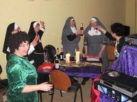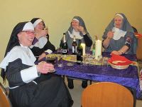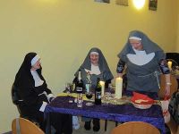 Die ersten Nonnen und Mönche trafen pünktlich ein und machten es sich an unseren samtenen Tischen gemütlich. Messwein wurde auch gleich eingeschenkt und verkostet. Klosterbier war selbstverständlich ebenfalls gefragt.