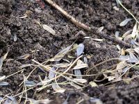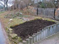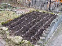 Wegen der anhaltend kalten Witterung konnte der Waid in diesem Jahr erst am 8. April in den Boden gebracht werden. Das Beet hatten wir im letzten Herbst tief umgegraben und diesmal sämtliche Waidpflanzen heraus genommen. Das Beet brauchte eine intensive "Kur", da der Boden nun doch ziemlich ausgelaugt zu sein schien. Dafür sprachen auch die letzten eher mäßigen Ernteergebnisse. Es wurde Rinderdung in Form von Pellets und Taubenmist eingearbeitet. Jetzt, nach dem Winter wurde der Boden nochmals durchgearbeitet und die Reihen für die Saat gezogen. Wie immer sollten es auch in diesem Jahr fünf Reihen werden, zu denen sich die Pflanzen aus dem Topf am Lindenborn gesellen sollten. Zunächst wurde aber gesät und die Schötchen leicht mit Erde abgedeckt. Im Anschluss kamen die Erklär-Tafeln wieder an den Rand des Beetes.