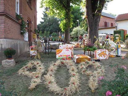 Bei Kaffee und Kuchen verging der sonnige Waidfestnachmittag wie im Fluge und vor dem Bürgerhaus waren immer mehr Kunstwerke zu bewundern, die in der warmen Luft trockneten. Farbige Fahrräder und verzierte Koffer mit den verschiedensten Mustern warteten darauf in Hochstedt verteilt zu werden.