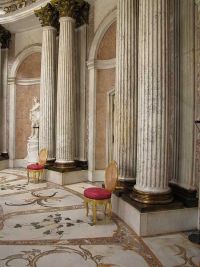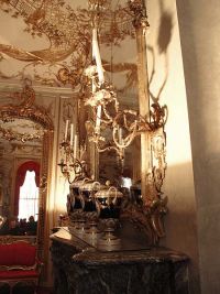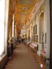 Diese Mühle befindet sich in unmittelbarer Nähe zum Schloss, das wir besichtigen wollten. Nach wenigen Minuten hatten wir den langgestreckten Bau auf dem Gipfel des königlichen Weinbergs erreicht. Zunächst konnte jedoch die Keramikausstellung besucht werden, was nichts anderes bedeutete als dass man die Toiletten aufsuchen konnte. Kurz darauf begann dann der Rundgang im Schloss Sanssouci. Der Name bedeutet auf französisch "Ohne Sorge" und sollte dies wohl für seinen Erbauer hauptsächlich ausdrücken. Es wird als das preussische Versailles bezeichnet. An das bei Paris liegende Schloss des Sonnenkönigs Ludwig XIV reicht Sanssouci jedoch nicht heran. Potsdams Geschichte als Residenzsstadt dauerte von 1660 unter Friedrich Wilhelm dem Großen über dreihundertfünfzig Jahre an, bis zur Abdankung Kaiser Wilhelm II. nach dem Ersten Weltkrieg.