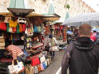Nachdem wir den Checkpunkt für Touristenbusse erreicht hatten, stiegen wir, umringt von tiefschwarzen Händlern, die Taschen, Uhren, Gürtel und Vieles mehr verkauften, in einen Zubringerbus um und fuhren etwa zehn Minuten bis vor die alte Stadtmauer. Auch dort waren die Händler sofort zur Stelle und hielten uns ihre Artikel vor die Nasen. Wir gingen an vielen Ständen mit allerlei Mitbringseln vorbei - wobei Schiefe Türme in jeder Größe überwogen - und folgten gleichzeitig der hohen Stadtmauer.