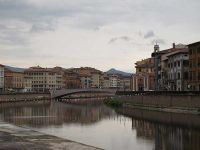 Das Tor erreichten wir nach wenigen Metern und schon als wir es durchschritten, hatten wir einen guten Blick auf das Baptisterium - eine der größten Taufkirchen der christlichen Welt- , den Dom und den Schiefen Turm dahinter. Unzählige Touristen drängten sich vor den Rasenflächen und hatten, als Hintergrund zum Fotografieren, den Schiefen Turm gewählt. Sie machten eigentümliche Verrenkungen und ließen sich so ablichten, als würden sie den Turm umschieben oder stützen – je nachdem welche Seite gewählt wurde. Wir gingen an den drei Gebäuden, dem Hauptweg folgend, vorüber und fotografierten was das Zeug hielt. Sie waren komplett mit Carrara-Marmor verblendet, wobei der Turm wegen seiner 4,1 Meter Schieflage besonders ins Auge sprang. Dann, am Schiefen Turm angelangt, schlugen wir den Weg in die Straße St. Maria ein und folgten ihr in Richtung auf den Arno zu.