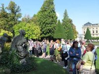Wir verließen die Residenz und setzten die Führung im Hofgarten fort, wohin wir durch ein Barockportal gelangten. Über uns wölbte sich noch immer der ungetrübte, eigentlich sommerlich blaue Himmel, der den Garten ins rechte Licht setzte. Neben Skulpturen und Brunnen mit Wasserspielen waren die alten zu Kegeln geschnittenen Koniferen ein echter Blickmagnet. Rings um den zentralen Brunnen wechselten sie sich mit Bänken, Rasenflächen und Blumenrabatten ab.