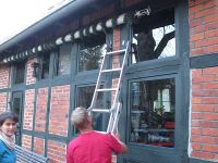 Der Maibaum 2015 sollte ja wie in jedem Jahr am 30. April aufgestellt werden. Vom Juni bis Ende April fristet er immer sein Dasein unter dem Dachkasten des Museums auf der Seite zum Bürgerhaushof hin, wo er auf dort angebrachten Haken Platz findet. Beim Museumsputz, Mitte April, war nun aufgefallen, dass ein Vogel aufgeschreckt vom Maibaum aus davon flatterte. Einige Tage darauf wurde während der 131. Vereinssitzung am 21. April die Situation überprüft und im Ergebnis ein Amselnest auf dem querliegenden Maibaum vorgefunden. Die Amselfrau brütete bereits und verfolgte gespannt, vermutlich irritiert und angstvoll, was die Menschen unter ihrem Nest trieben. Das Maß für die Amselfrau war voll, als diese Menschen eine Leiter an die Wand unter ihrem Nest anlehnten und eine Menschenfrau dann auch noch auf der Leiter nach oben stieg. Sie flog aufgeregt davon und beobachtete aus sicherer Entfernung, was die Menschen nun machten.