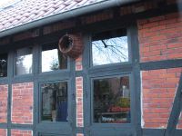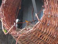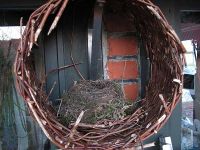Betrübt sah sie dabei zu, wie ihr mühsam auf dem Maibaum errichtetes Nest von diesem getrennt wurde. Es wurde von der Leiter herunter gereicht und jetzt konnte sie jeder sehen: fünf grünliche Eier, die Eier, die sie gelegt hatte und ab dem dritten Ei in den letzten Tagen schön warm hielt und bebrütete. Ängstlich verfolgte die Amselfrau, wie die Menschen den Maibaum von der Halterung herunter hoben um ihn im Museum zu deponieren. Dann standen die Menschen in einer Gruppe herum und betrachteten mit grinsenden Minen die Eier der Amselfrau, die langsam auszukühlen drohten. Misstrauisch beobachtete sie, wie einer der Pflanzkörbe, die im letzten Jahr noch vor dem Museum Margeriten beherbergten und sich nun teilweise in seine Einzelteile auflöste, da der Boden herausgefallen war, auf eine der Halterungen des Maibaums gesteckt wurde. Dort hinein stellten die Menschen das Nest und entfernten anschließend die Leiter. Nach einiger Zeit traute sich der Amselmann bis zur Dachrinne des Museums heran und die Amselfrau flog vor dem Korb auf der Stelle und begutachtete das, was die Menschen angestellt hatten. Nach einer Festigkeitsprobe entschied sie sich dafür, das Gelege weiter zu bebrüten.