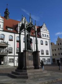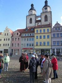 Weiter ging es an einem gemauerten Bachlauf entlang, der die Straße begleitete. Wir kamen zum Marktplatz mit dem langgestreckten Bau des Rathauses und den zentral errichteten Denkmälern von Melanchton und Luther. Frühe  stand hier das Schafott, erzählte die Stadtführerin und sie kramte in ihrer Erinnerung eine Geschichte heraus, wie ihr Mann und sie vom Fenster eines am Markt stehenden Hauses aus, eine Hinrichtung beobachten konnten, wie schön und entzückend anzusehen diese war. Am Markt steht auch die Stadtkirche von Wittenberg, in der Luther vorrangig gepredigt hatte, in der auch der erste evangelische Gottesdienst stattfand. Die Stadtführerin erzählte von den Türmern der Stadt die oben in luftiger Höhe ihre Wohnung gehabt hatten, dort sogar eine Ziege hielten, um sich mit Milch zu versorgen. Sie meinte, dass die Kinder des Türmers dort oben aufgewachsen sind und als sie zum ersten Mal auf der Erde standen erstaunt gewesen waren, wie groß Pferde eigentlich sind. Da sie alle viertel Stunden die Glocke zu läuten hatten, fragte man sich außerdem wie die Türmer zu ihren Kindern gekommen seien.