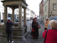 Wir lachten und gingen weiter durch ein enges Gässchen bis zur Rückseite der Kirche. Dort, an der südöstlichen Außenwand war ein Relief angebracht, welches die Juden verspotten sollte, die sogenannte Judensau. Ein Stück weiter befindet sich der Holzmarkt mit einem Brunnen. Dabei handelte es sich um einen Röhrbrunnen, der zu einer frühen Wasserleitung gehörte, die im 16. Jh. hier für frisches Wasser sorgen sollte. Die Stadtführerin meinte, dass seitdem das Wasser zum Bierbrauen nicht mehr aus dem Bach entnommen wurde, das Gebräu seine Würze verloren hätte. Kein Wunder, wurde doch vor der Wasserentnahme durch Ausrufer darauf hingewiesen, dass am nächsten Tag gebraut würde und dass sämtliches Einbringen von Unrat, Wäschewaschen, Fäkalienzufuhr und ähnliche Sachen zu unterlassen seien. Wer allerdings diesen Ausrufer verpasst hatte ....