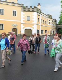 Am Ende gelangten wir zum magischen Brunnen, wo Bier gezapft und verkostet wurde. Allerdings hatte es inzwischen tatsächlich angefangen zu regnen. Wir suchten Unterschlupf unter einem Baugerüst, das dort aufgestellt war. Das Chodovar aus dem Brunnen schmeckte herzhaft würzig und wir ließen es uns schmeken.