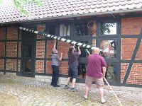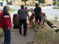 Zuvor war jedoch der Abbau des Maibaumes geplant, der seit Ende April vor dem Bürgerhaus stand und nun schon recht vertrocknet und braun aussah. Schnell war er aus der Hülse gehoben und der Kranz abgenommen. Der Stamm wurde wieder unter das Dach des Museums gebracht und der Kranz abgeschmückt.