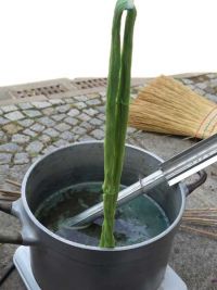 Um zu sehen, ob unsere Färbechemikalien überhaupt noch zum Färben taugten, wurde am Nachmittag eine Probefärbung durchgeführt. Schon beim Einrühren des Waschsoda zeigte sich blauer Schaum - im Waid war also Farbe!