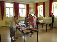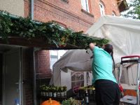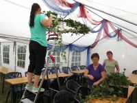 Auch das Färben selbst klappte wunderbar - damit konnte, was dies betraf, am nächsten Tag nichts schief gehen. Unmittelbar neben des Färbetopfes wurde mit anderen Farben gearbeitet. Das Kinderprojekt sollte wieder mit malen zu tun haben. Dabei durften die Knirpse sich diesmal mächtig beim Bemalen eines PKW ins Zeug legen. Dieser wurde zunächst präpariert, wobei die Teile, die nicht mit Farbe in Berührung kommen sollten abgeklebt werden mussten. Im Bürgerhaus war man unterdessen beim Kuchenschneiden, denn zahlreiche Kuchenbleche waren inzwischen dort abgegeben worden. Auch galt es weiter an der Dekoration zu feilen. Neben Getreidegarben mussten die Kronleuchter nun mit frischem Grün behangen werden.