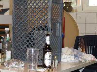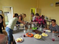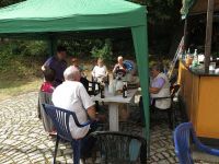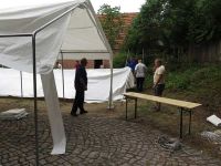 In Rekordzeit waren die Zelte abgebaut. Bereits um 11.00 Uhr erinnerte nichts mehr daran, dass sie dort vor Stunden noch standen außer die Abdrücke im Gras. Dabei musste vorher die gesamte Elektrik inklusive der Kronleuchter und die Stoffbahnen abgenommen und einsortiert werden. Wir hatten uns das Mittagessen wahrlich verdient, zumal es wirklich zu regnen angefangen hatte. Im Herd machten wir uns die Rester vom Vortag warm und ließen sie uns schmecken. Nach dem ersten Regenguss kam die Sonne herbvor und wir stellten einen Pavillon auf und saßen gemütlich beisammen vor der Theke.