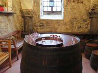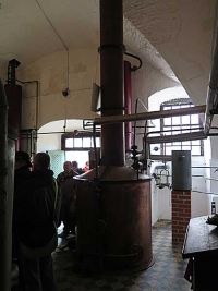 Wir betraten durch eine Flügeltür den lang gestreckten Bau, der vor uns lag und befanden uns direkt in der Brennerei. Unser Führer erzählte, dass die Brennerei von Hochprozentigem in Wöltingerode Tradition hat. So wird seit 1682 in Wöltingerode Korn aus eigenem Anbau gebrannt und zu Edelkorn und Likören verarbeitet. Nach alter Klostertradition wird dabei aus klarem Brunnenwasser, Gerstendarrmalz und Weizen von den eigenen Klosterländereien in kupfernen Brenngeräten zunächst ein Rohbrand hergestellt. Danach erfolgt in der Klosterdestille der zweite Brand. Das Ergebnis ist ein 96-prozentiger Feinbrand, der nur noch die Kornaromastoffe enthält. Mit Quellwasser aus dem Klosterbrunnen wird dieser Grundstoff auf 38 Prozent Alkohol verdünnt. Danach wird der Korn mindestens ein Jahr in Eichenfässern in der alten Krypta gelagert. Aus dem hochprozentigen Grundstoff werden durch Zugabe von Pflanzen-, Frucht- und Kräuteraromen, teilweise nach alten Rezepturen, auch verschiedene Liköre hergestellt. Unser Führer hier in der Brennerei, hielt eine Flasche mit Körnern hoch uns sagte, dass am Ende diese Menge Korn in der Flasche für die gleich Menge Kornbrand ausreichen würde.