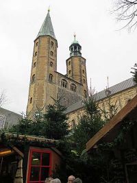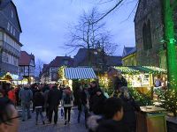 Vom Parkplatz bis ins Zentrum war es nicht weit. Nach etwa fünf bis zehn Minuten gemächlichen Ganges war die Altstadt mit dem Weihnachtsmarkt erreicht. Die Kirche Cosmas und Damian wurde ab 1170 errichtet. Mit ihren unterschiedlichen Turmspitzen beherrscht sie hier den Marktplatz. Direkt vor der Kirche war auch ein erster Glühweinstand. Daneben schloss sich das Rathaus von Goslar an, dessen Baubeginn im 15. Jahrhundert lag.