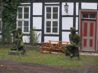 Einen weiteren Höhepunkt des Weihnachtsmarktes von Goslar bildet der Weihnachtsweld. Hier stehen Tannen an Tannen, die mit einem Lichternetz überzogen sind. Dazwischen befinden sich Glühweinbuden und Platz zum trinken. Wir gingen ein Stück in die Nebengassen und entdeckten das Puppen- und das Musikinstrumentemuseum mit zwei Skulpturen, die vor dem Haus sitzen. Harzer Hexen dürfen als Puppen und Mitbringsel natürlich nicht fehlen