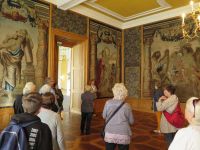 Kurz darauf kam der Höhepunkt der außergewöhnlichen Führung, denn wir lernten auf barocke Weise zu tanzen und uns zu drehen. Im Anschluss besichtigten wir die Antikensammlung, die mit Miniaturen, und die Porzellansammlung. Wir gingen durch Salons und Säle in verschiedenen Farben, mit Velourstapete, Wandbildern und bestehend aus Wänden mit Bücherregalen. Es gab Spiegelkabinette, Spiegelsäle, Schlafzimmer mit Ankleide- und Garderobennischen, sowie Fest- und Vorzimmer. Alles das war in barockem Stil und damit sehr reich an Verzierungen ausgestattet. Die Prinzessin führte und belehrte uns über Gepflogenheiten in ihrer gehobenen Stellung. Immerhin gehörte sie zum hohen Adel Europas. Sie gewährte uns am Ende ein Potrait vor ihrer Kutsche für unsere Miniaturensammlung und verabschiedete sich - ein Handkuss von den Herren war selbstverständlich.