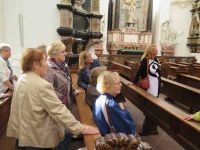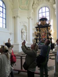 Wir teilten uns in zwei Gruppen auf und die Führungen begannen. Das erste Thema der Stadtführung war der Dom St Salvator. Fulda hatte drei Schutzheilige, von denen zwei auch an der Fassade in Form von Skulpturen in Nischen dargestellt waren. Simplizius und Faustinus. Von der dritten Schutzheilige, der Schwester der beiden Brüder, Beatrix, gibt es in ganz Fulda keine Skulpturdarstellung. Die drei Heiligen finden sich im Wappen als drei Lilien wieder. Die Wichtigste Skulptur an der Domfassade ist die des Bonifatius, dessen Gebeine im Dom bestattet sind.
