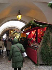 Wir gelangten durch die alte Stadtbefestigung in das Innere der Stadt, der Altstadt. Mittelalterlich anmutende Häuser säumten die Straße. Es ging ein Stück bergan und vor uns ragte eines der Stadttore auf. Als wir es passiert hatten war auch schon der Weihnachtstrubel auszumachen. Wir bogen jedoch von der Straße ab, die geradewegs in den Trubel hinein zuführen schien und kamen am Kriminalhistorischen Museum vorbei. In dessen Hof hing an einem kranartigen Gebilde ein hölzerner Käfig, in welchem früher die Bäcker bestraft worden waren, wenn ihre Waren zu wenig wogen. Sie wurden dann mitsamt dem Käfig ins Wasser getaucht.