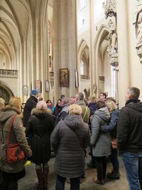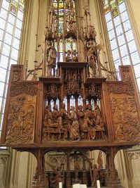 Herausragend in der zwischen 1311 und 1484 errichteten Kirche ist der herrlich gearbeitete Schnitzaltar von Tilman Riemenschneider, den alle bewunderten. In diesen von 1500 bis 1505 entstandenen Altar integriert, ist ein Kreuz mit einem Bergkristall als Reliquie, die Weintropfen des letzten Abendmahls Christi enthalten soll (durch Wandlung - zum Blut Christi). Dieses Abendmahl war auch das Thema der Altarschnitzereien. Die Stadtführerin erklärte, dass Riemenschneider für seine hervorragenden Figuren weniger Lohn erhalten hatte, als jener Schnitzer, der den Rahmen gearbeitet hatte. Der Altar stand quasi über einer Nebenstraße, die wir später noch sehen würden, und war über eine hohe Treppe zu erreichen.