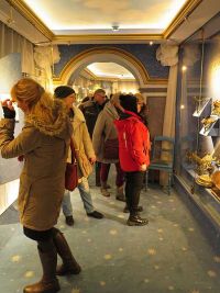 Glitzer und Glimmer an jeder Wand und in jeder Ecke warteten auf uns, Christbaumschmuck aus vergangenen Zeiten gab es ebenso zu bewundern in den Räumen des Museums, wie auch Weihnachtsmänner, Weihnachtsbaumständer, Pyramiden, Glöckchen, Kugeln, Lametta aller Epochen und noch viel mehr. An einem der Bäume konnte man selbst geschriebene Wünsche oder Grüße befestigen und ihn damit schmücken.