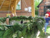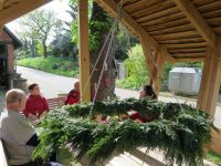 Während unseres Museumsputzens hatten wir die Idee den Hochstedter Maikranz diesmal ganz öffentlich zu binden. Am 27. April 2018 gingen wir ans Werk. Zum Kranzbinden eignete sich ausgezeichnet die überdachte Bank vor dem Bürgerhaus, weil man im Gebälk ganz wunderbar den Kranz aufhängen konnte, um ihn dann im Sitzen zu binden. Eine Flasche Bier passte auch noch auf den Tisch über dem der Kranz schwebte.