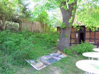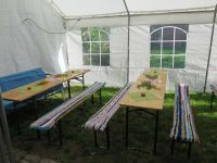 Tische und Stühle standen bereit, wie auch diverse Getränke. Die Bratwurstroste rauchten ebenfalls schon und ein fertig zusammengebautes Insektenhotel als Anschauungsmuster lag auch schon parat als die ersten Gäste kamen. Wir wollten ja auf den Maiveranstaltungen Insektenbehausungen für den Selbstaufbau anbieten, um damit ein bisschen etwas gegen das Insektensterben und den Naturschutz zu tun. Ein entsprechender Artikel war zuvor im "Hockschter Ausrufer" erschienen. Zusätzlich hatte die Bürgermeisterin noch Wildblumensamen und Informationsmaterial von einer Naturschurtzorganisation mitgebracht.