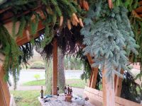 Einen ganz besonderen weihnachtlichen Schmuck hatten wir uns für die Adventszeit 2018 ausgedacht. Neben dem Silbernen Weihnachtsgeschenk am Lindenborn mit der Adventskerze, welches die Frauentreff-Frauen immer gestalteten, sollte es am Bürgerhaus noch mehr funkeln als in den Vorjahren. Jetzt hatten wir ja schließlich eine Minzebank unter den Kastanien stehen, die herausgeputzt werden konnte. Bereits im Vorjahr war die Bank mit Tannengrün geschmückt worden. In diesem Jahr sollte der grüne Schmuck auch wieder an die Bank gebracht werden, zusätzlich zur Geltung gebracht mit LED-Lichtern. Noch vor dem Weihnachtsbaumsetzen ging es ans Werk. Am 24. November 2018 giung die Schmückerei der Minzebank los.