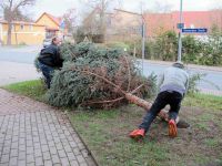 Diesmal kam der Baum aus einem Garten an der Straße Am Bürgerhaus, musste also nicht quer durch Hochstedt gefahren werden. Bereits am Vortag war der Baum gefällt worden und hatte dabei seine prachtvolle Spitze eingebüßt. Es wurde schon gelacht, weil Erfurt seinen "Rupfi"-Weihnachtsbaum hat und wir nun unseren "Knicki". Der Baum wurde jedoch fachmännisch wieder zusammengeflickt, so dass man nichts mehr vom "Unfall" sah.