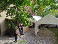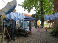 Allerletzte Dekorationen vervollständigten unsere Vorarbeiten. Das Färberzelt stand fertig eingeräumt vor dem Museum und wartete auf erste Besucher. Und trotzdem mogelte sich die Sonne durch die Wolken und ermöglichte ein übliches Foto mit grell reflektierenden Zeltdächern in der Sonne.