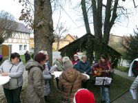 Ehe man es sich versah, stand der Baum bereits in der dafür vorgesehenen Hülse. Die Zuschauer am Bürgerhaus beobachteten gelassen das senkrechte Ausrichten des Baumes mit einem Becher Glühwein in der Hand und einem Stück Schittchen auf dem Teller aus sicherer Entfernung. Sie hatten sich an den Stehtischen eingerichtet, während die Liedermappen verteilt wurden.