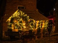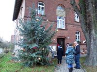 Groß und Klein schmückten den Baum. Eine Kugel hier, eine Kugel da, bis alle am Baum glänzten. Inzwischen dämmerte es und im Pavillon wurde es gemütlich, während draußen allerlei Lichter blitzten.