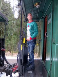 Gleich nebenan öffnete sich ein Lok-Schuppen, aus dem dampfend und schmauchend eine Dampflok heraus fuhr. Mit einem Tannenbaum vorne geschmückt, sah sie recht weihnachtlich aus. Anscheinend handelte es sich um die Lok, die unsere Hänger ziehen würde. Wir sahen uns eine Weile im Schalterraum um, wo man neben den Fahrkarten auch allerlei Souvenirs erwerben konnte und stiegen dann in unsere reservierten Waggons ein. (der Dritte und Vierte von hinten)