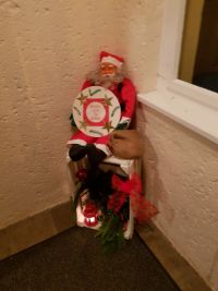 Die letzte Vereinssitzung des Jahres fand ganz im Zeichen der Weihnachtszeit statt. Nicht zuletzt deshalb weihnachtlich, weil der Frauentreff zuvor im Raum des Bürgerhauses seine Weihnachtsfeier begangen hatte. Schon am Eingang des Bürgerhauses wurde man also vom Weihnachtsmann persönlich, auf einer Holzstiege sitzend, begrüßt.