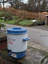 Vom Weihnachtsabaumaufstellen war noch genug Glühwein übrig, um am 15. Dezember noch einmal an die Minzebank einzuladen, zum gemeinsamen heißen Trunk. Wir hatten entsprechende Einladungenin der Vorwoche in der Bäckerei aufgehangen und das Glühweingerät am Sonntag dann ab 13.00 Uhr befüllt. Da wir kein großes "Brimborium" machen wollten, wurden Sitzkissen auf die Minzebank gelegt und jeder sollte seine Tasse selbst mitbringen.