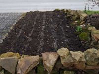 Nachdem das Beet nun pflanzenlos war, ging es ans Düngen. Wir hatten Kuh-Pellets vom vergangenen Jahr übrig, die nun als Dünger dienten. Die Pellets wurden eingearbeitet und dann wieder unsere fünf Reihen gezogen, in die der Waidsamen ausgebracht wurde.
