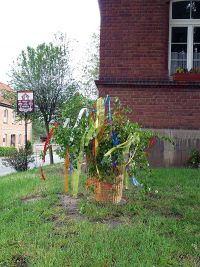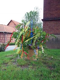 Bedingt durch die Corona-Pandemie und der damit einhergehenden Beschränkungen, war es im Jahr 2020 auch nicht möglich einen Maibaum aufzustellen. Beim Aufstellen des Maibaums gab es sonst immer Bratwurst und Bier in geselliger Runde, was aber nun nicht möglich war. Ein kleiner dekorativer Ersatz wurde dennoch gefunden: ein in aller Stille dekorierter Maikorb. Dieser wurde quasi über Nacht an Ort und Stelle hingestellt, mit grünen Zweigen und bunten Bändern geschmückt, ganz ohne Bratwurstduft und Frühlingsliedern.