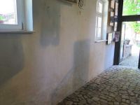 Nach dem Ausräumen konnte man die schadhaften Stellen an der Wand deutlicher erkennen. Nach der Entfernung des Putzes war ein Neuanstrich der gesamten Wand geplant.
