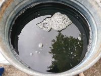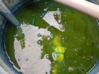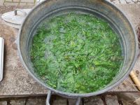Das mittlerweile kochende Wasser wurde über die gewaschenen und zerstückelten Waidblätter gegossen. Das ganze ruhte nun für zwei Stunden. Während dieser Zeit würden sämtliche Inhaltsstoffe aus den Waidblättern ins Wasser gezogen sein. Es hatte sich nach dieser Ruhezeit auch dunkelbraun gefärbt. Das Wasser konnte nun abgegossen und durch ein Tuch gefiltert werden, wobei sich schon bläulicher Schaum zeigte. Die Blätter waren nun zu nichts mehr zu gebrauchen und wurden hinter dem Waidbeet entsorgt, wo sie sich zersetzen würden.