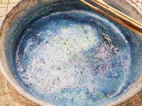 Nach Zugabe von Waschsoda schäumte die Färbebrühe und es zeigte sich das erste Blau. Nach der Gabe von Natriumdithionit verschwand der Schaum zum größten Teil und die Flüssigkeit sah grüngelblich aus.